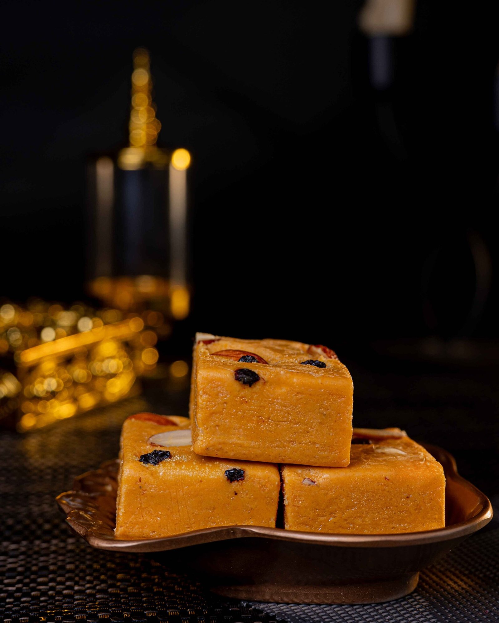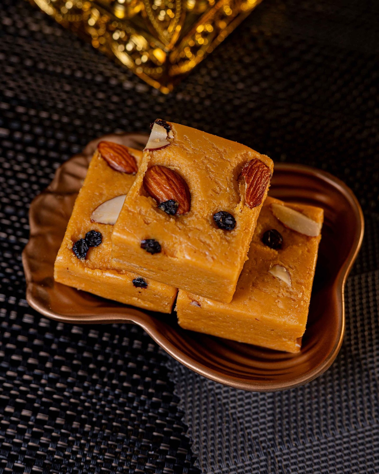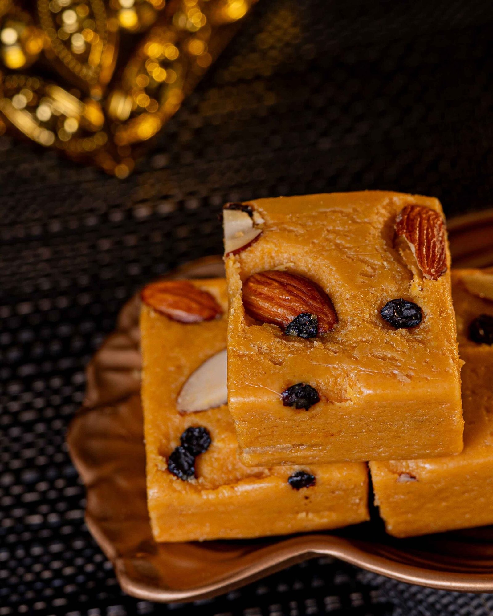 Each block is a shimmering golden cube of tightly woven, paper-thin sugar strands that collapse effortlessly on the tongue, releasing a burst of nutty sweetness.