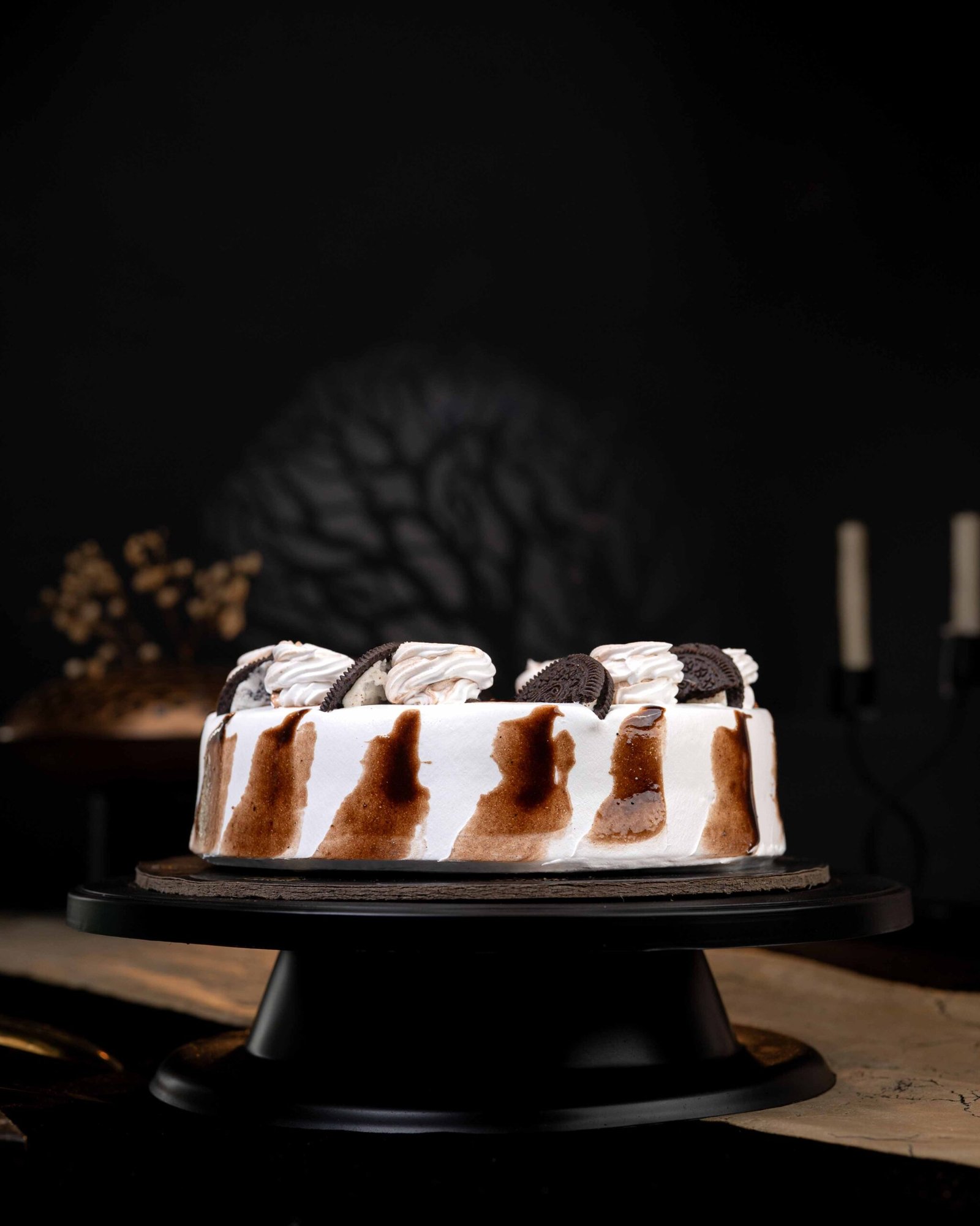 Chocolate Oreo Cake featuring layers of deep cocoa sponge and airy cookies-and-cream frosting, it’s topped with whole Oreos for a satisfying crunch. The perfect balance of rich chocolate and nostalgic creaminess.