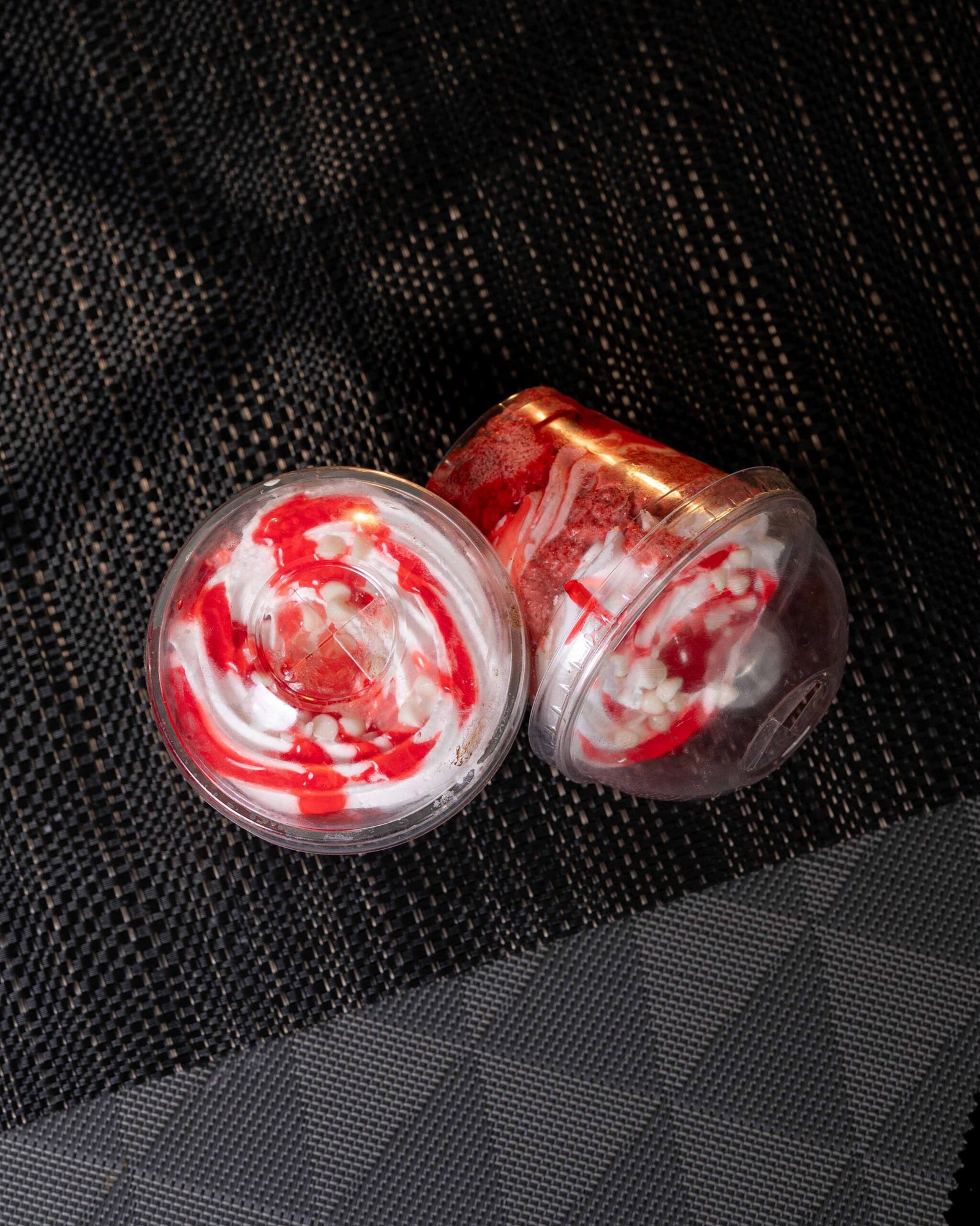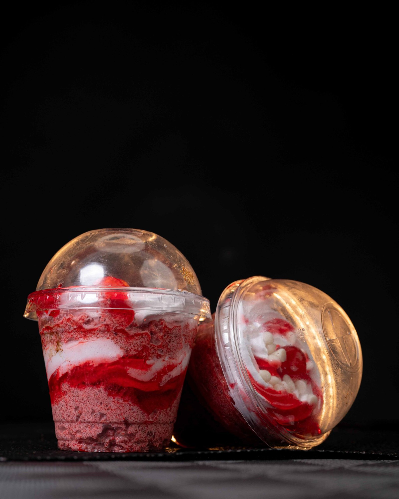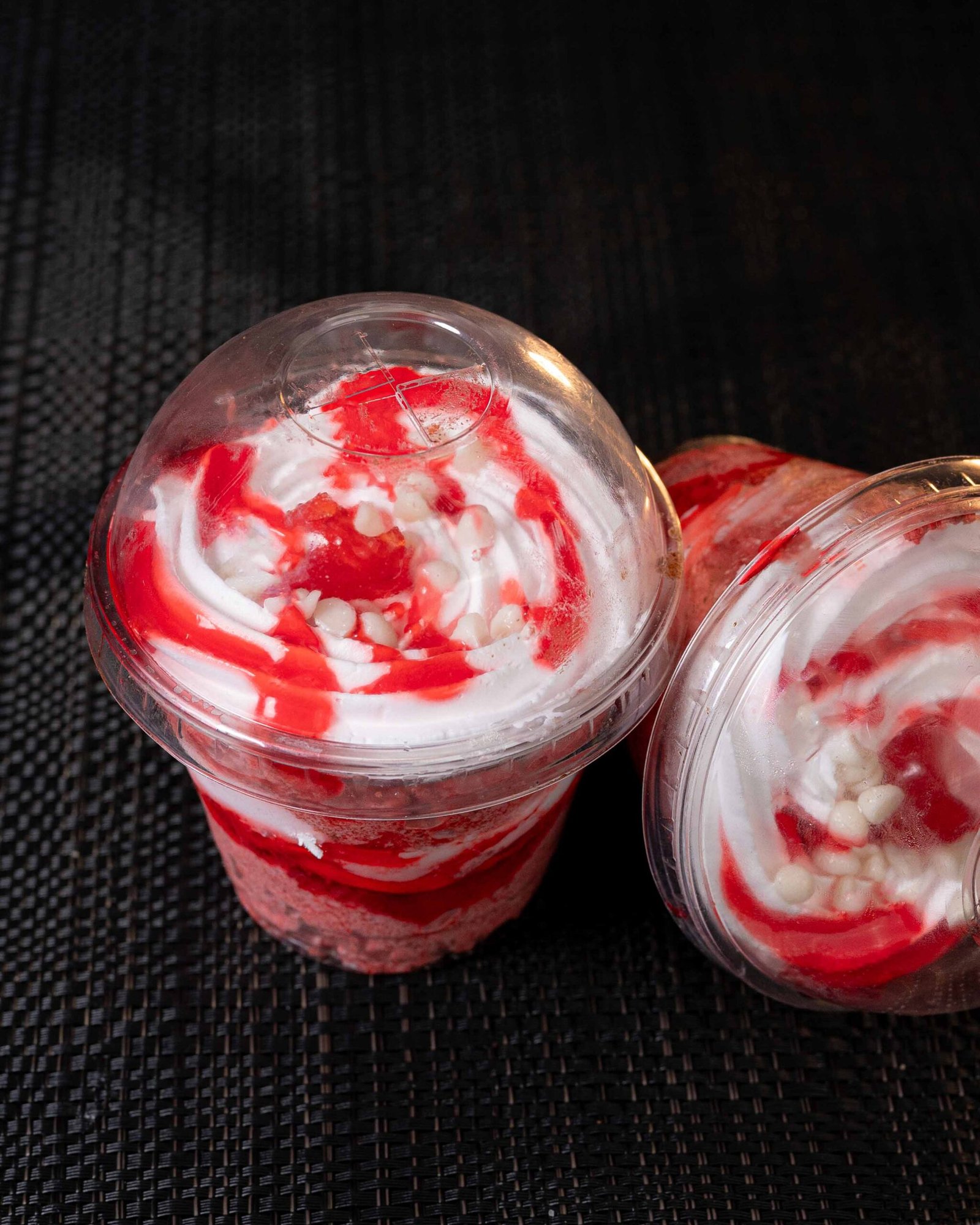Each layer is generously infused with a house-made strawberry compote, crafted from sun-ripened berries simmered to their peak sweetness, ensuring an authentic burst of fruit in every bite.
